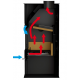 CLEAN GLASS SYSTEM (SCL): besteht aus dem Eintritt von Luft von außerhalb des Geräts (Sekundärluft), die zur Innenseite des Glases geleitet wird, wodurch die Verbrennung verbessert wird, eine schnelle Schwärzung des Glases verhindert wird und eine bessere Sicht auf das Feuer ermöglicht wird.